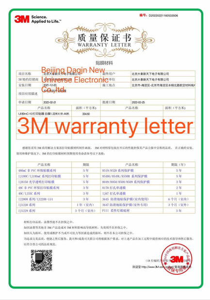 Standard:3M Warranty Letter Numero:D202202211605335506 Data tecnico Problema:2022-02-25 Data di scadenza:2025-02-24 Ambito di applicazione / Gamma:3M Material Films Rilasciato da:3M Franchised Dealer |